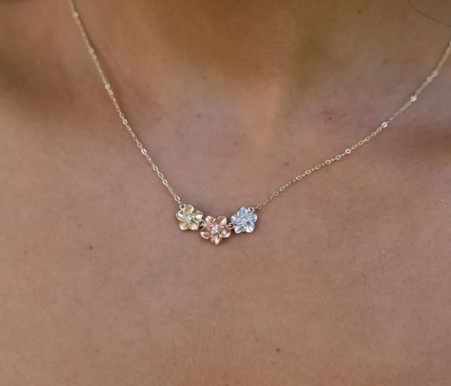 Çiçek tasarımlı kolye. Üç çiçek yan yana ve taş mıhlama ile dizayn edilmiş kolye…