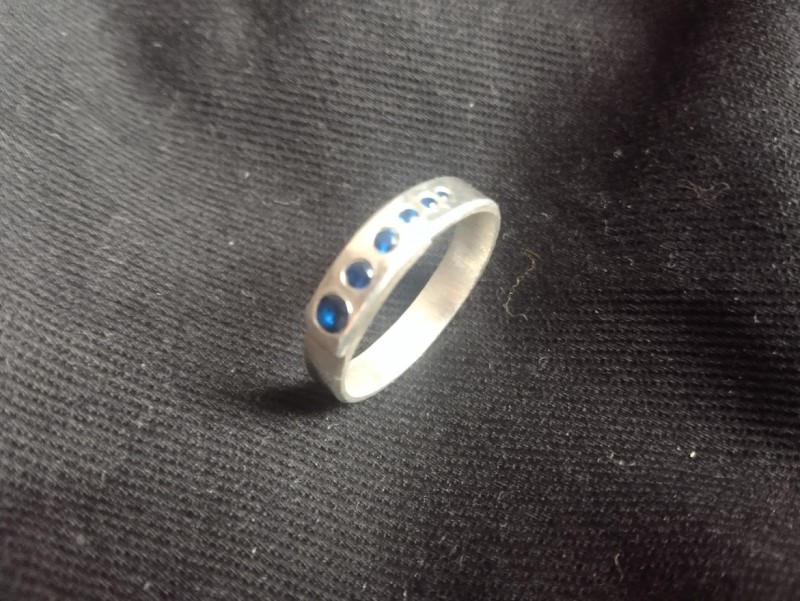 Büyükten küçüğe doğru mavi sıra taş mıhlanmış gümüş yüzük.
